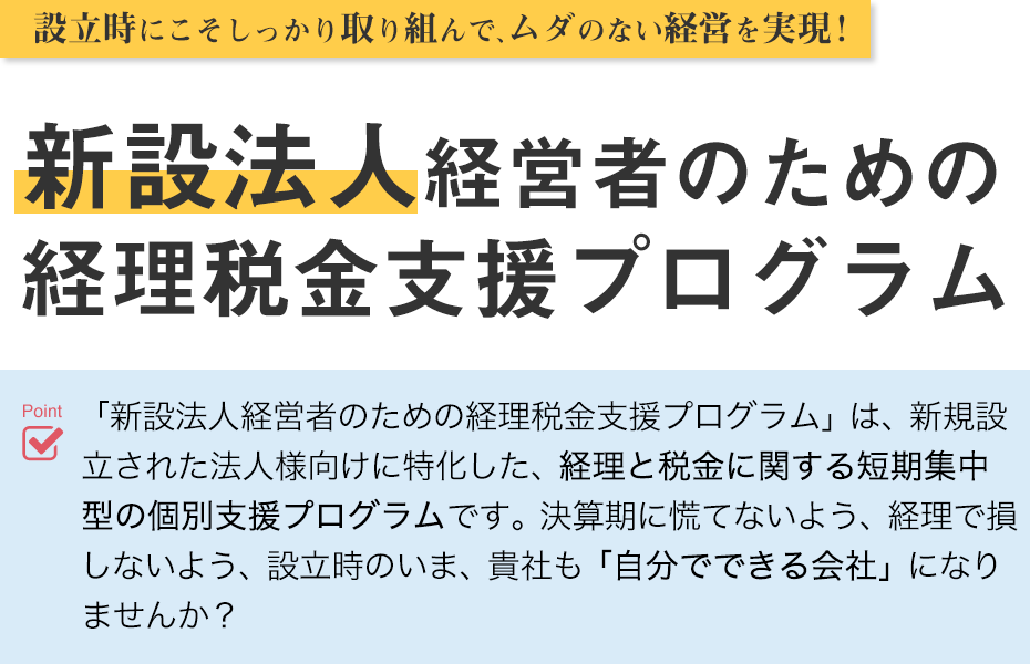 また、法人設立初期に必要な税金手続や税金の基本的な知識が身に付き、税金に対する不安の解消や節税などに活かせます。